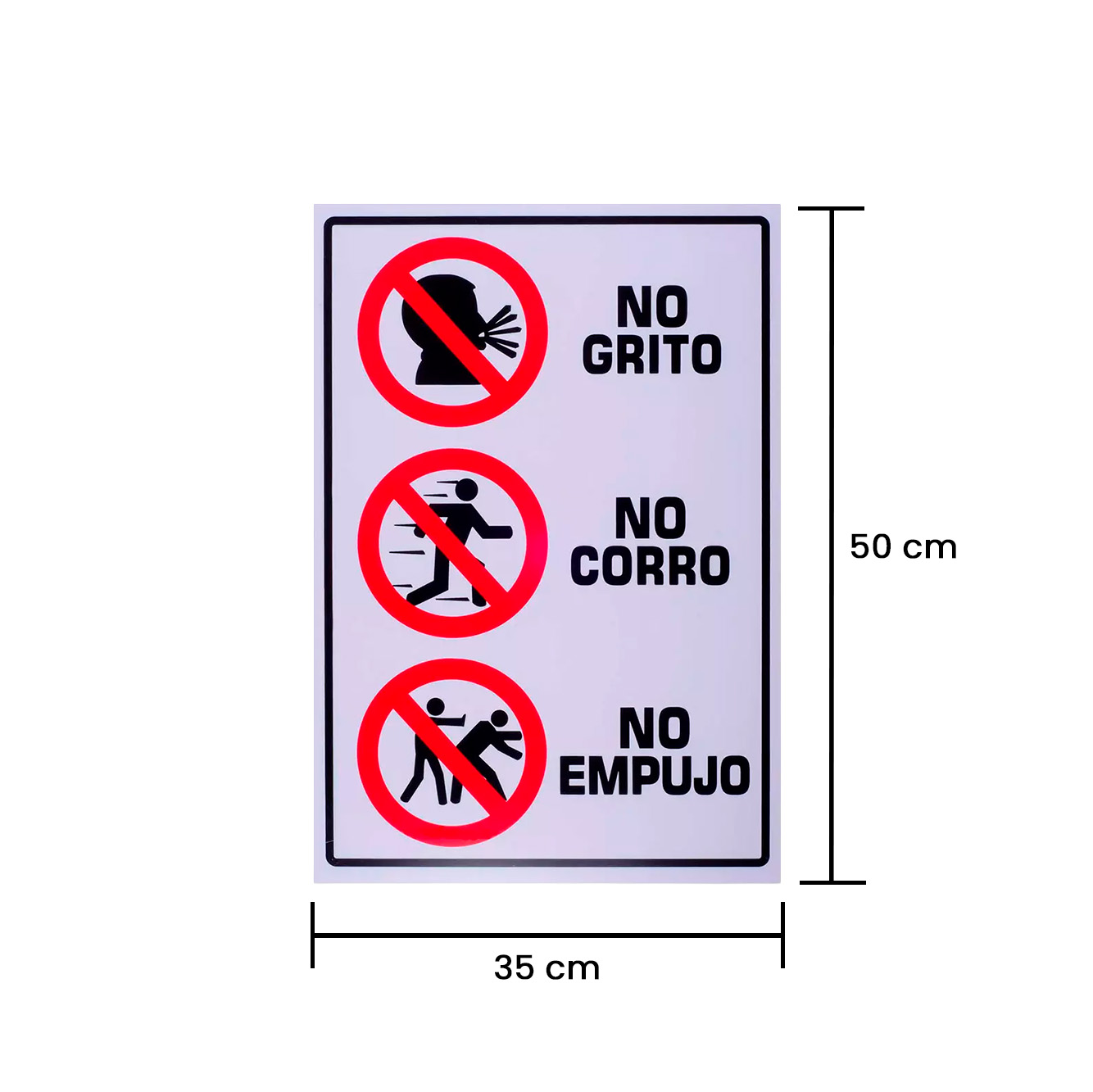 La señal No Grito-No Corro-No Empujo está diseñada para reforzar conductas ordenadas durante situaciones de emergencia. Fabricada en estireno y con un formato de 35 × 50 cm, ofrece una visibilidad adecuada en distintos espacios. Su diseño con fondo blanco, texto negro y gráficos representativos permite una lectura clara e inmediata. Este señalamiento funciona como apoyo visual para reducir riesgos y mantener el orden durante una evacuación.